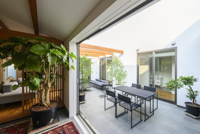 リビングからはタイルテラスへとつながり、さらにロの字に囲まれたもう一つパティオも備えています。