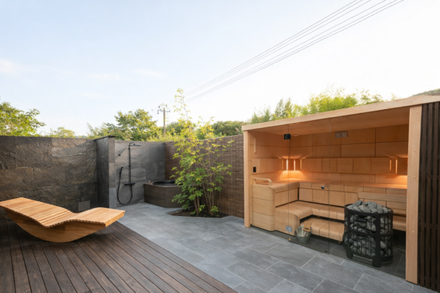 普段からご友人をよく招くご夫婦のために、ゲストルームに加え、サウナと露天風呂を備えた贅沢な空間に。